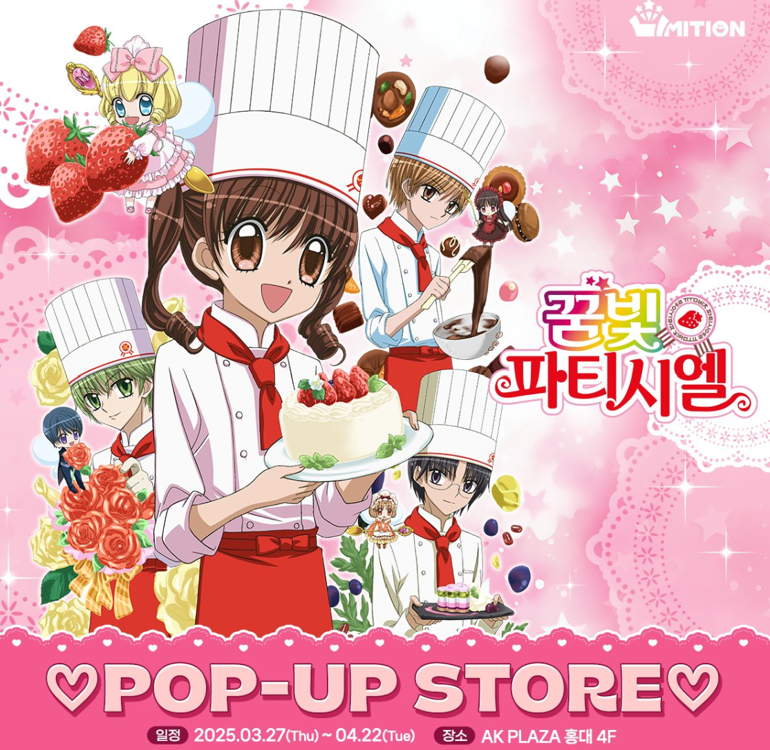 바로 전데요, 3월27일부터 국내 최초로 "꿈빛파티시엘: 파업스토어가 홍대에서 개최됩니다. 단 4일 간만 진행되는 팝업스토어이니 "꿈빛 파티시엘"을 보며 케이크 1-2개쯤 만들어보신 분이라면 꼭 방문해서 애니메이션의 감성을 다시 한번 느껴봐요!