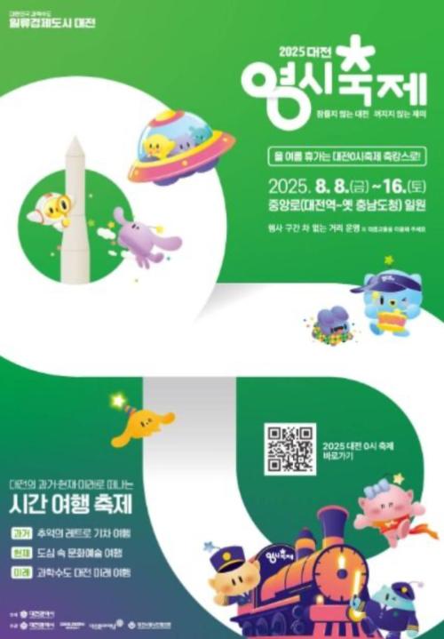 ‘잠들지 않는 대전 꺼지지 않는 재미’라는 축제의 캐치프레이즈를 필두로, 8월 8일부터 16일까지 9일간, 대전에서 여름을 뜨겁게 달굴 대전 0시 축제는 대전역에서 옛 충남도청 구간까지 약 1km 중앙로를 중심으로, 레트로 기차마을에서 떠나는 추억여행을 시작으로 대전의 과거와 현재, 미래를 아우르는 다양한 공연과 체험 프로그램이 무료로 펼쳐집니다.뜨거운 여름, 시원하게 대전 0시축제에서 놀아보는 건 어떨까요?