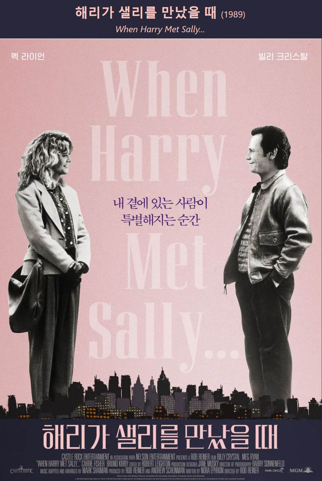 1989년에 개봉한 로맨틱 코미디영화, 해리 버네스틴과 샐리 알머슨이 서로 다른 성격과 관점을 가지고 있지만 우연한 만남을 통해 서로에게 끌리고 사랑에 빠지는 이야기로 로맨틱 코미디의 경전과도 같은 영화입니다. 세상에서 제일 귀여운 여자 맥라이언과 세상에서 제일 재미있는 남자 빌리크리스탈, 잘 안어울릴것 같은 커플의 너무나도 재미있는 이야기입니다. 영화 보러 가 볼까요?