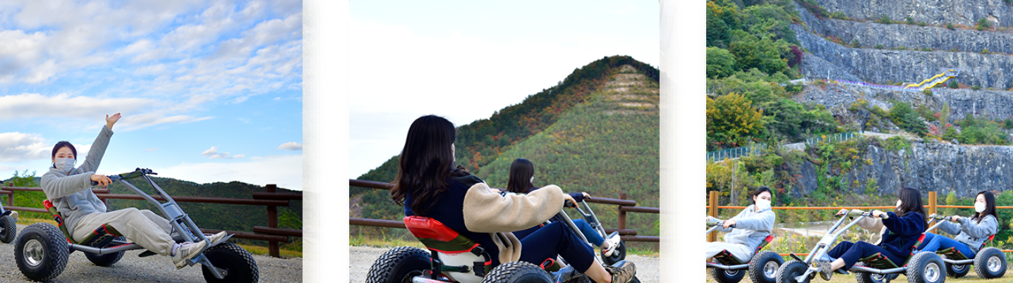 채석장 내 임시관리용 도로를 활용한 무동력 놀이기구로 총 길이 1.5km을 달리며 자연속에서 짜릿함을 느껴보세요.