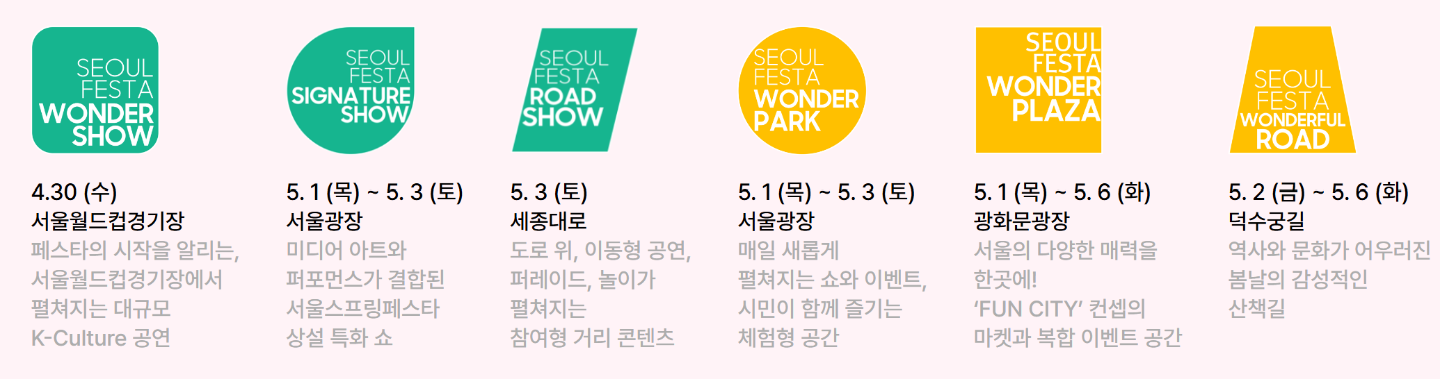 - 원더플라자: 광화문광장에서 운영되는 K-컬처 체험 구역으로, 서울의 놀라운 매력들이 한데 모인 FUN CITY콘셉트로 패션, 뷰티, 엔터테인먼트 주제별 부스가 운영됩니다.