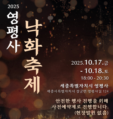 2025년 가을, 세종시에 위치한 영평사에서 펼쳐지는 ‘낙화축제’는 단순한 불꽃놀이가 아닌 전통 불교 의식과 예술, 자연이 어우러지는 특별한 볼거리를 제공합니다. 타닥타닥 타들어가는 불씨가 낙화봉에서 꽃잎처럼 흩날려 밤을 수놓은 특별한 행사에 소망을 빌어보지 않으시겠어요?