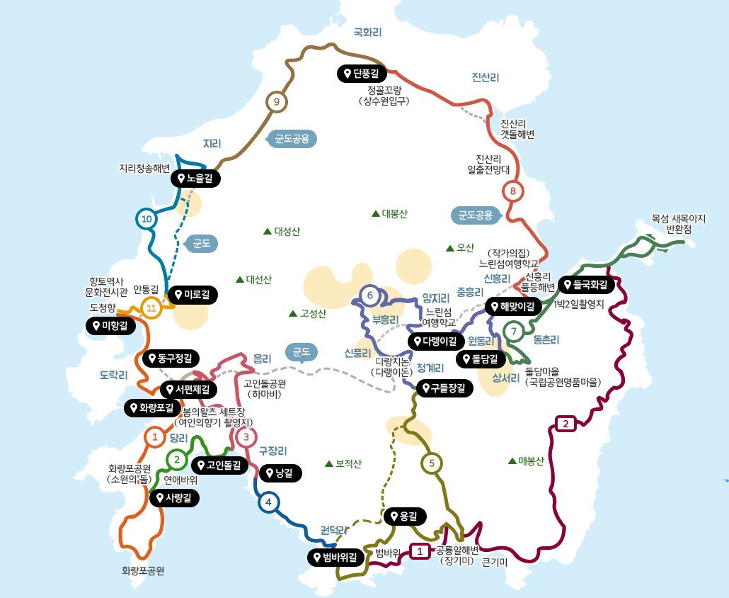청산도의 슬로길은 총 11개코스로 약 42.195km에 달하는 걷기 좋은 길로 걸으면서 푸른 바다, 산, 구들장논, 돌담길등 자연경관과 전통문화를 만끽할 수 있는 곳입니다. 특히 서편제길은 여오하 "서편제"의 촬영지로도 유명하며 그 외에도 해안 절벽을 볼 수 있는 사랑길, 넓은 백사장을 볼 수 있는 해수욕장등 천천히 걸으면서 청산도를 즐겨볼 수 있습니다. 청산도의 11개 코스 중에서 가장 대표적인 코스의 경로를 소개해드리니 참고하세요!