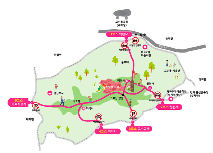 고려산은 높지는 않지만 코스마다 경사도와 풍경이 천차만별입니다. 본인의 체력에 맞춰 선택해 보세요.