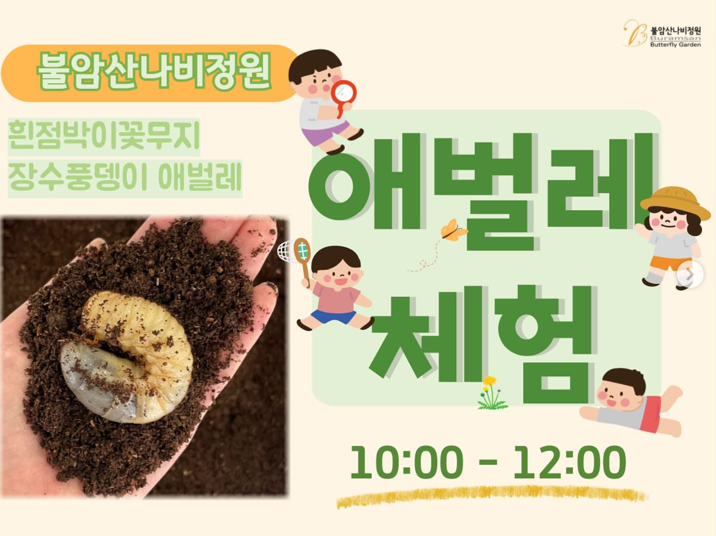 불암산 나비정원에서는 흰 점박이 꽃무지애벌레와 장수풍뎅이애벌레를 만나보는 체험 프로그램이 준비되어 아이들이 정말 좋아합니다. 평일 13시~16시에는 무료로 나비설명회도 열고 있으니 아이들과 가는 분들은 시간 맞춰서 꼭 참가해 보시기 바랍니다.