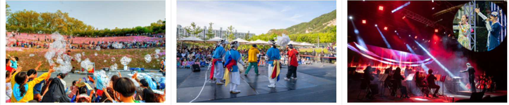 | 드로잉+서커스 결합공연 | 비눗방울공연, 전통 연희공연 | 국악&힙합 퓨전콘서트 | 오케스트라,국악공연/팝핀현준 | ||