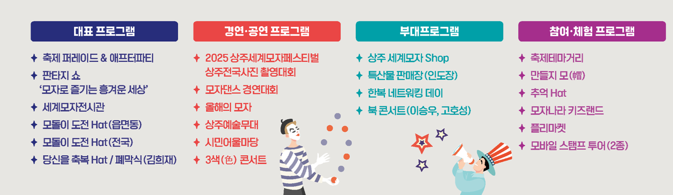 2025 상주세계모자페스티벌! 모자를 테마로 한 독특한 콘셉트와 화려한 공연 라인업으로 매년 수많은 관람객들의 발길을 사로잡고 있는데요,특히 올해는 트로트 가수 김용빈이 출연해 축제의 열기를 더할 예정이라 더욱 기대를 모으고 있습니다.