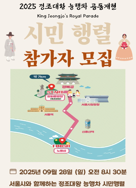 2025년 9월 28일 단 하루! 서울부터 수원, 화성까지 이어지는 초대형 역사 퍼레이드, 2025 정조대왕 능행차 공동재현 행사에 대한 소개입니다. 조선 역사상 가장 웅장하고 감동적인 왕의 행차 중 하나로 애민정신과 효심이 뛰어나며 정치와 문예의 가장 큰 부흥을 이뤘던 정조의 8일간의 여정을 담아 현대에 되살아난 역사문화행사입니다.