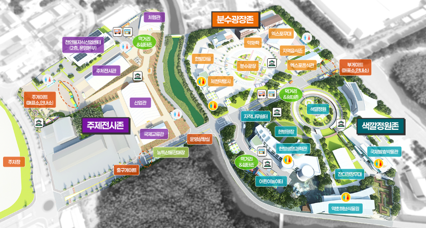 - 엑스포기간 동안은 교통통제가 이루어지므로 아래의 주차장, 셔틀버스 정보를 참고하시기 바랍니다. 엑스포공원까지는 셔틀버스도 운행예정이니 가능한 대중교통을 이용하여 방문하시면 더욱 좋겠습니다.