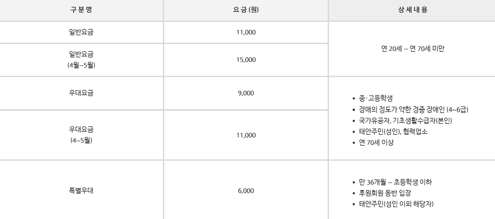 - 입장료 : 일반 15,000원 / 우대 11,000원 / 특별우대요금 6,000원