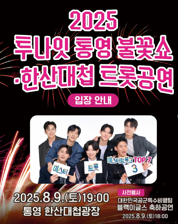 2025년 제64회 통영한산대첩축제가 8월 8일부터 8월 14일까지 경상남도 통영시 통영한산대첩광장 일원에서 개최됩니다. 이 축제는 이순신 장군과 한산대첩이라는 한국 역사상 중요한 해전을 기념하며, 전통문화와 현대 공연, 체험을 아우르는 국내 대표 호국 역사 축제입니다. 특히 8월 9일에는 미스터트롯 3의 탑 7이 출연하는 한산대첩 트롯공연과 불꽃쇼가 19시부터 개최되어 많은 분들이 관심을 모으고 있습니다.해당 쇼에는 티켓소지자만이 입장할 수 있으므로, 가시려는 분은 꼭 미리 티켓을 받으시는 것 잊지마세요!