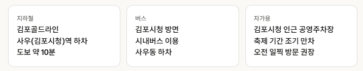 서울 강서구·마포 방면에서 오신다면 김포한강로 또는 올림픽대로를 이용하면 30~40분 내로 도착할 수 있습니다. 축제 당일(4월 11~12일)은 해당 산책로 구간 도로가 통제되므로, 우회 동선을 미리 확인해 두는 것이 좋습니다.